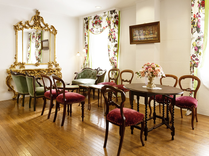 お客様のお待ちあいとしてご利用いただくこのスペースもすべて本物のアンティーク家具で統一されています。